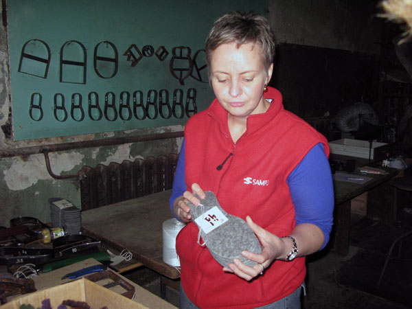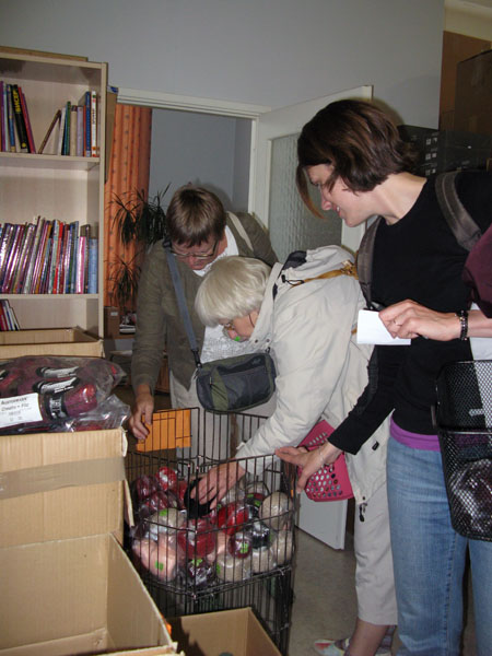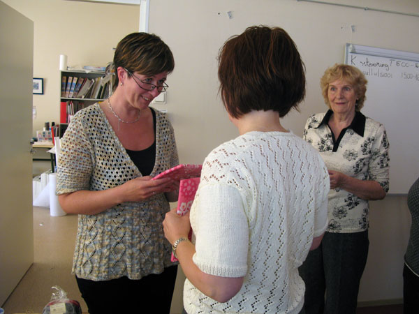 As an extra thanks for the fact that as an exception the teachers offered us this workshop we loaded them with presents. Also Irma the interpreter wasn’t forgotten. Everyone brought something, souvenirs from The Netherlands, handmade gifts, knitting gadgets. The row of knitters with presents to give was endless. But we were really thankful for this very special day. Aime wiped away a tear and the three of them waved us goodbye.