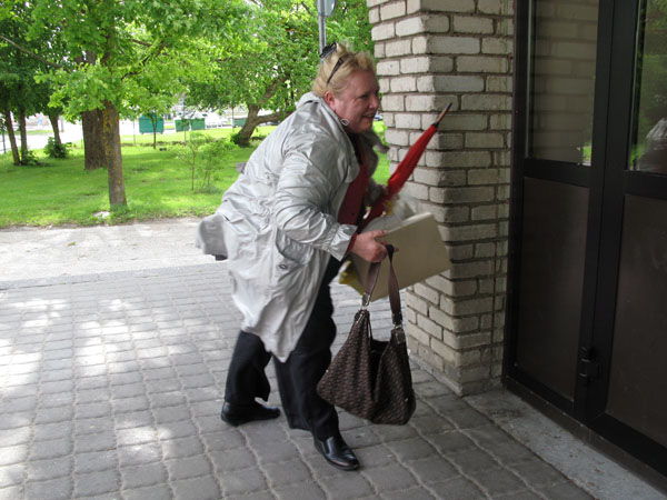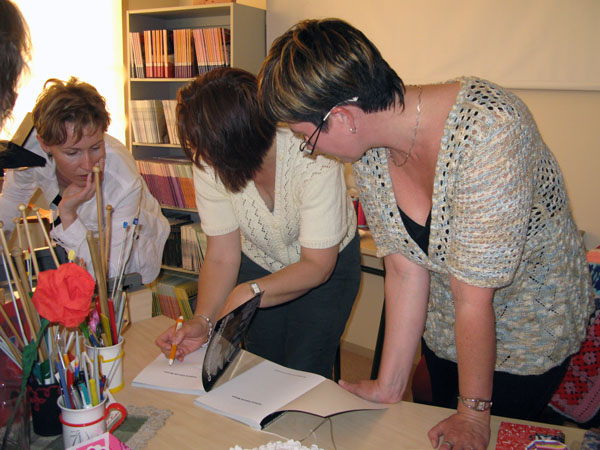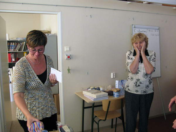 Nelleke, onze breivriendin die met manlief rondreisde door Noord-Europa, verlegde haar programma om de workshop bij te wonen. En wij gingen samen met Monika en Liivi met de bus naar Haapsalu. Daar werden we aan de ingang van het gymnasium begroet door Aime, Siiri en Irma de tolk. Het handwerklokaal, het mooiste lokaal van de hele school, was ingericht met allerlei kreatieve spullen aan de wand, waaronder twee enorme gequilte wandkleden met stukjes kantbreisel. Gewéldig!