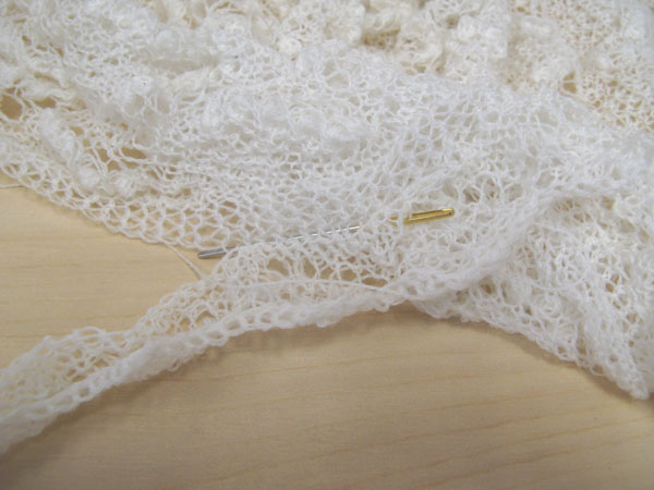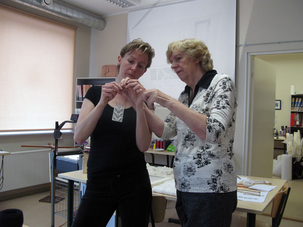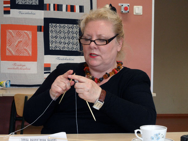 Tot de pauze werd de historie van de shawls verteld en voorbeelden getoond. Met het originele garen zetten we daarna steken op voor een minishawltje. Voor sommigen van ons een eitje, maar de beginnende kantbreiers hadden het knap moeilijk. Maar iedereen werkte zich moedig door de opdrachten heen. Zelfs Jans. Aime en Siiri vonden Hil en mij saaie cursisten omdat we weinig begeleiding nodig hadden, maar toen we na de pauze stevig doorvroegen op de kleinste details, snapten ze dat we de kans grepen om onze eigen workshops volkomen perfect te maken. En omdat ze zelf perfectionisten zijn, vonden ze dat alleen maar leuk. Gelukkig bleken er weinig aanpassingen nodig zodat onze cursisten van de workshop Estlands Kant gerust kunnen zijn.