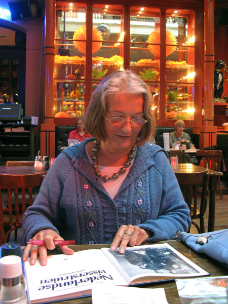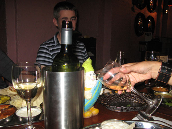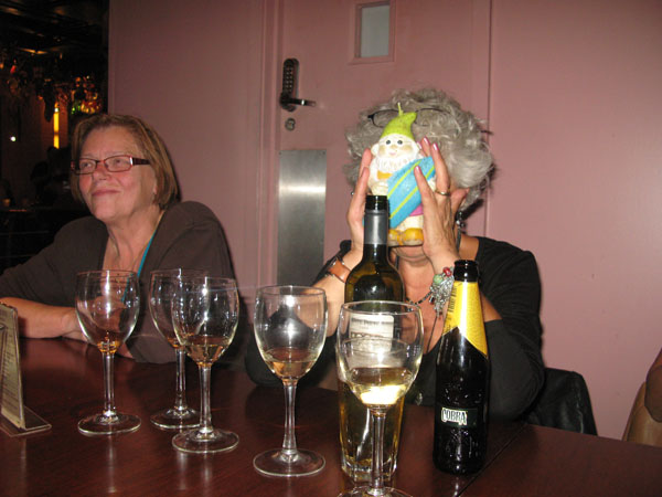 Friday after the fair organizer Gerard invited us to the pub for a drink. It was fabulous, being together and enjoying a gigantic glass of beer after a fantastic day. Corry didn’t want her picture taken, but fortunately her gnome did. The gnome also witnessed Titia’s drinking bout while we had an Indian diner, according to tradition at Masala Zone at Covent Garden.