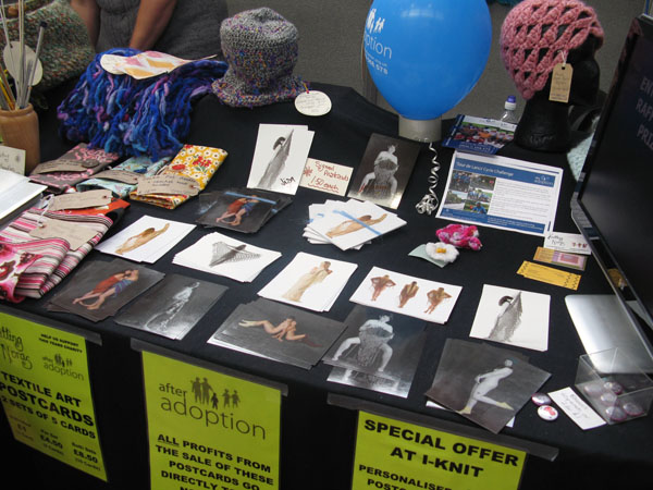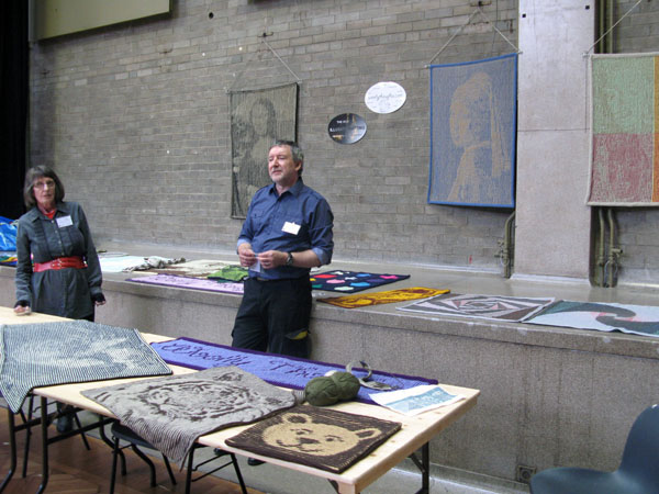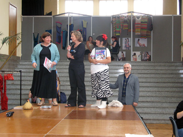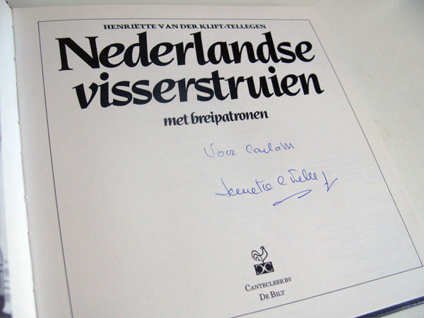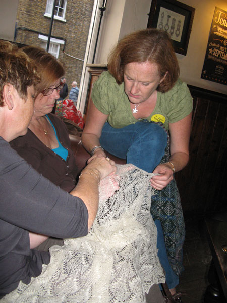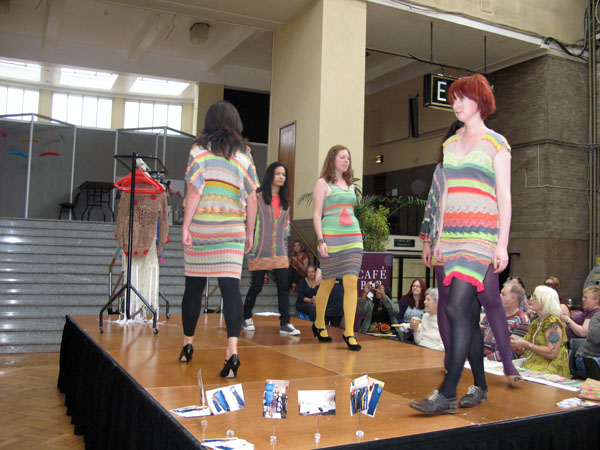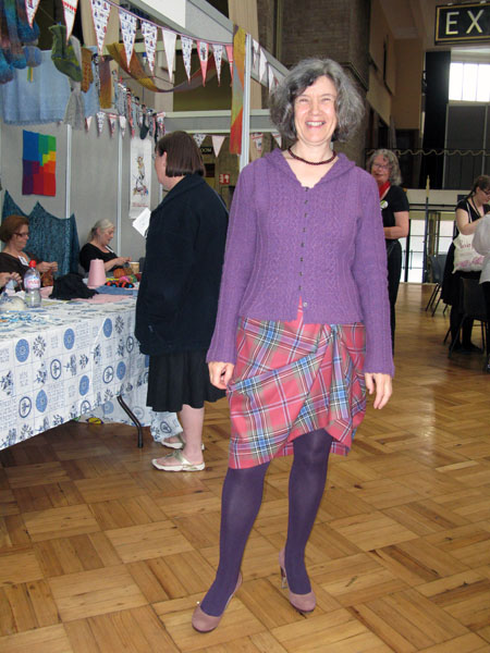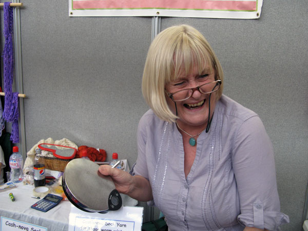 Habu was present as well, all the way from New York. And Wooly Thoughts, with mysterious shadow knitting, EasyKnits, assisted by Marleen from Dutch Knitting Designs this time, Wensleydale Longwool Sheep Shop and many more traders with an assortment of yarns for the real yarn snob. At Coleman I bought, among other things, a knitting sheath, with which you should be able to walk and knit at the same time. The Shetlanders made up to 200 stitches a minute with it. So they say. That’s promising. I’ll report you on my findings with this intriguing object.