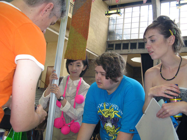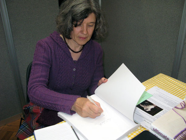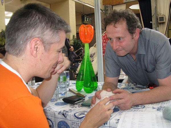 Habu was er ook, helemaal vanuit New York. En Wooly Thoughts, met mysterieuze schaduwbreisels, EasyKnits, dit keer bijgestaan door Marleen van Dutch Knitting Designs, Wensleydale Longwool Sheep Shop en nog veel meer handelaren met een assortiment voor de echte yarnsnob. Bij Coleman kocht ik onder andere een breischede, waar je lopend mee zou moeten kunnen breien. De Shetlanders haalden er 200 steken per minuut mee. Zeggen ze. Dat belooft wat. Ik zal jullie verslag doen van mijn experimenten met dit intrigerende attribuut.