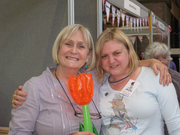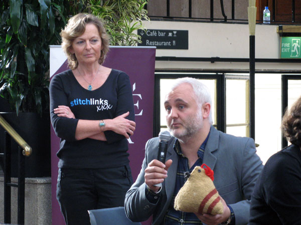 Dit was alweer het vierde jaar dat we het Dutch Knitting Cafe organiseerde tijdens IKnit Weekender in Londen. Wat komen we toch graag ieder jaar in Londen naar dit fantastisch leuke event. Dit keer kregen we een prachtig plekkie vlak bij het podium waardoor we midden in de actie zaten en breiers lekker even mee konden breien. En naast Eirwen van de KnitWitches met al haar verleidelijke garens. Ze verkocht zo goed dat ze aan het eind van de beurs de bedragen wilde aanslaan op haar weegschaal. Gerard kreeg als dank voor de organisatie van ons jaarlijks breifeest de plastic tulpen uit het café, waar ook Eirwen zo weg van was we er haar ook maar eentje toegeschoven hebben.