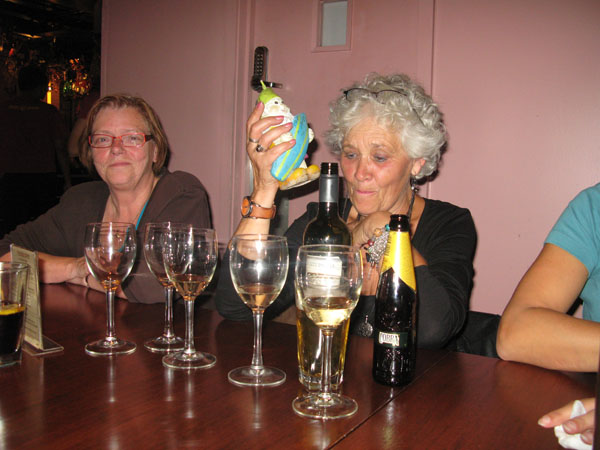 Vrijdag na afloop van de beurs nodigde organisator Gerard ons uit om mee te komen borrelen in de Engelse pub The Barley Mow. Gewéldig, daar zit je dan samen aan een gigantische beer na te genieten van een geweldige dag. Corry wilde niet op de foto, maar haar kabouter gelukkig wel. Die kabouter was ook getuige van het drankgelag van Titia tijdens het Indiase dineetje, traditiegetrouw bij Masala Zone in Covent Garden.