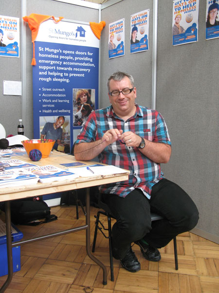 This was the fourth time we organized the Dutch Knitting Café during the IKnit Weekender in London. How glad we are to participate in this fantastic event every year. This year we had a splendid spot close to the stage, so we were placed in the centre of the action and knitters could easily join us for a few rows of knitting. And we were right next to Eirwen of the Knitwitches with all her alluring yarns. She sold so well that she wanted to strike the amounts on the scales instead of on the till. As a thank you for organising our yearly knitting party we gave him the plastic tulips from the cafe. Eirwen loved them too so much that we had to give her one too.