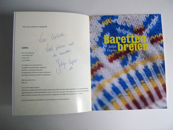 Debbie Stoller started it, Stitch ‘n Bitch, or Knitting and Chatting. She searched the internet to find friends to knit with in a café in New York. In the Netherlands there are now more than 100 groups. Two years ago I met her again in New York and knitted together with her at the first Stitch ‘n Bitch the West village. She wrote a few books about the phenomenon, a bit of basic knitting knowledge and some patterns. But now it is time to get serious, so she wrote Superstar Knitting. In this book she explains the more complex techniques for the more experienced knitters. Double knitting, better increases and decreases, Fair Isle and steeks, short rows and Stich Witchery, as she named it. And even though she added a chapter explaining about designing your own stuff, she added 41 patterns from a variety of designers. One of them is me.