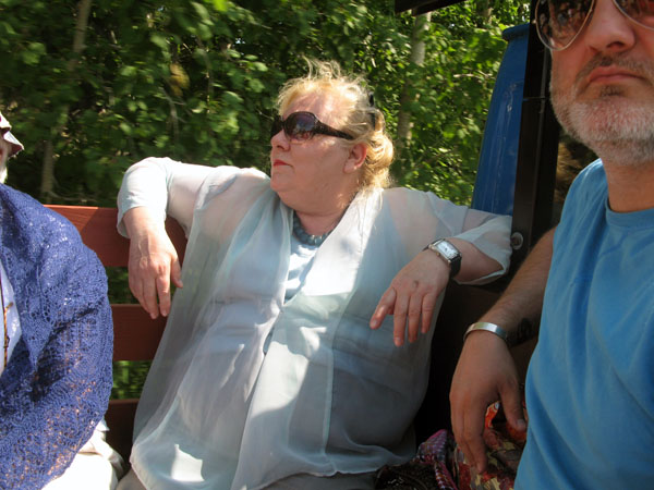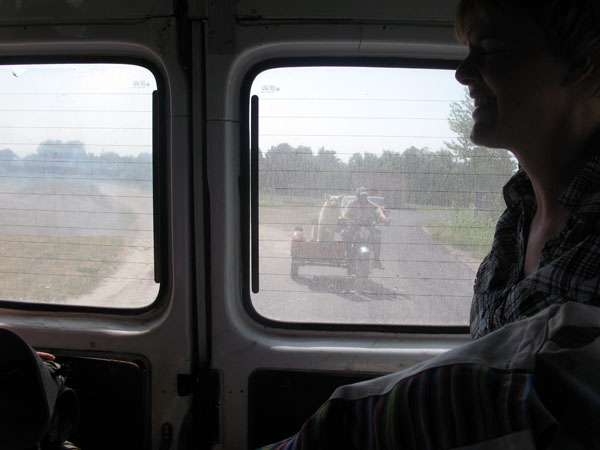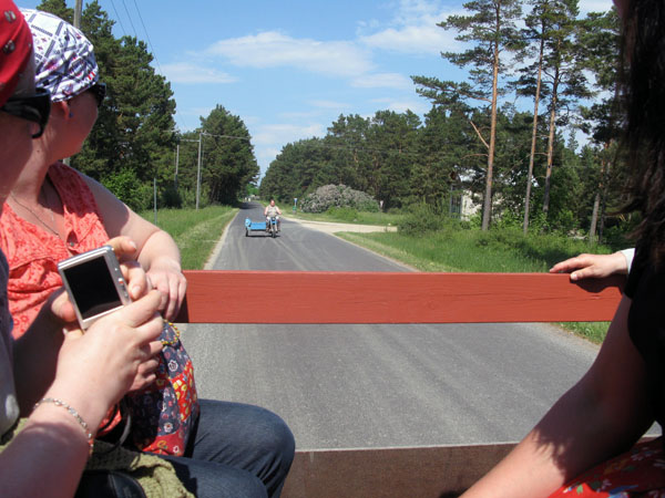 Maar soms houdt zo’n Kihnu taxi er opeens mee op en moet je een stukje lopen of overstappen op een luxer modelletje, namelijk een half verroest oud busje, wederom met houten bankjes. Dan kan je maar beter in de zijspan van je baasje’s motor zitten, meehelllend in alle bochten en met je oren in de wind.