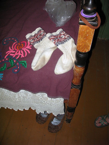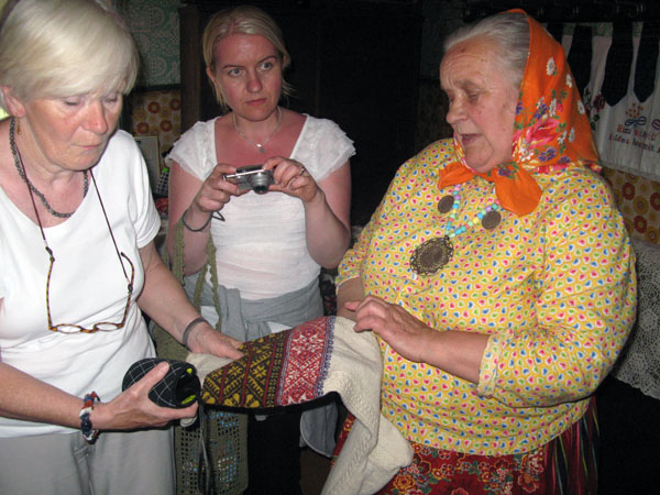 There is so much to see in the little house. Everywhere something is hanging or laid to be admired. Roosi tells about the items and Monika translates her stories into English. Wonderful stories about the surrendering of patterns, the traditions and about collecting urine for dying yarn. Roosi sings the song about how the menn on the island asked God for a blue sheep and I do understand why…… The musquitos had a feast, but it was worth it. Afterwards Roosi stayed in her old house. If you want to see more of all the beautiful things in Elumõnu, can buy the boek.