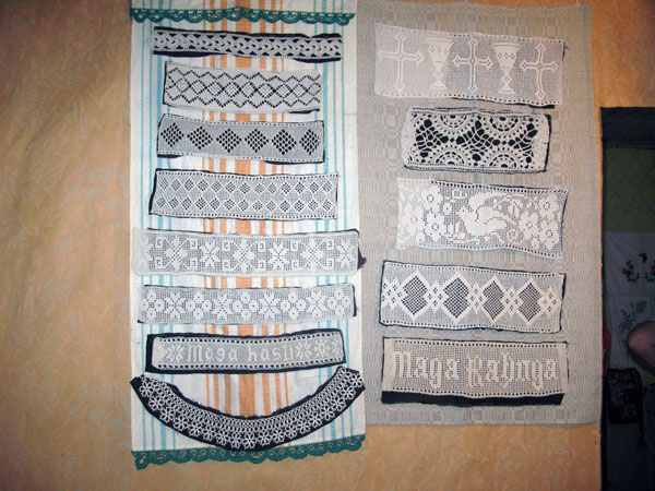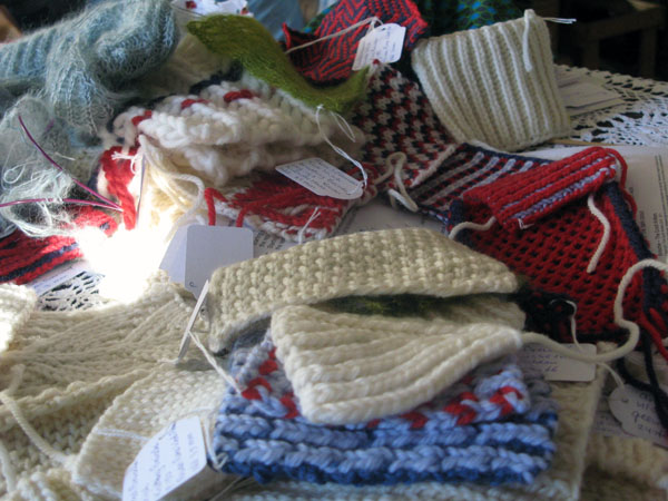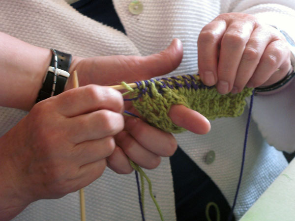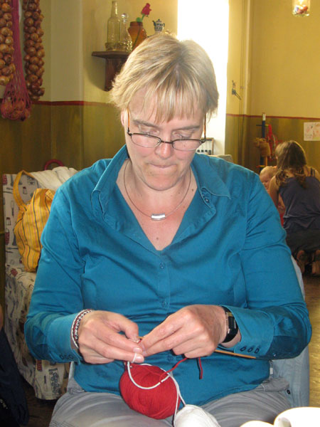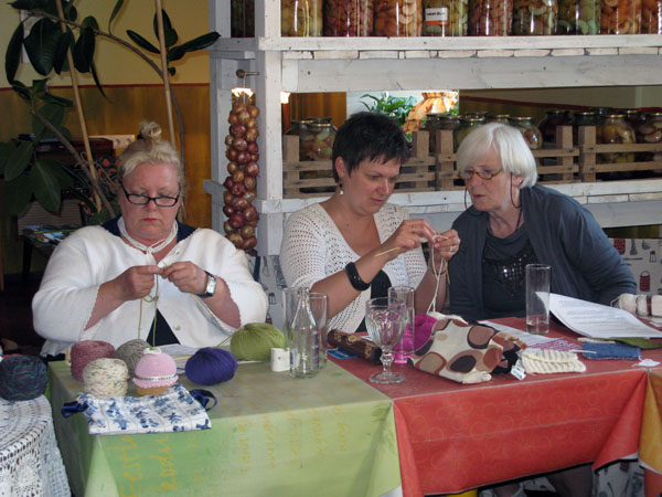 We also met Monika’s mother, who thought that we deserved a chocolate medal as survivors of a week under the guidance of her dauugther, so she brought one for all of us. Tasted great! She had dived out of a airoplane recently, so she deserved one too. Like Liine who knitted a dress in the technique of the Haapsalu shawls. Beautiful! And it matched my shirt so well. 🙂 Monika showed us how to hide a message in sock yarn. The kits with this yarn you can buy at Emma Leppermann in the center of Tallinn.