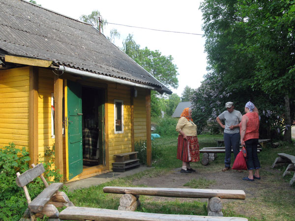 You know that you are privileged knitter when you get the chance to pick up Kihnu Roosi at her home, when cruising the island in a Kihnu taxi with your knitting friends. The chauffeur goes to the little house where she lives now she is getting older. Huge bushes of lilacs make this image to on that seems to be burned on your retina. After the workshop (more later), we go to Elumõnu, the farm where Roosi grew up and lived almost all her life. In these years she stuffed the little house with her beautiful crafts and patterns she collected. There is no lock on the door, but the broom under the door handle showes nobody is there. Afraid to be robbed? Try getting of the small island without being seen by someone of the island……