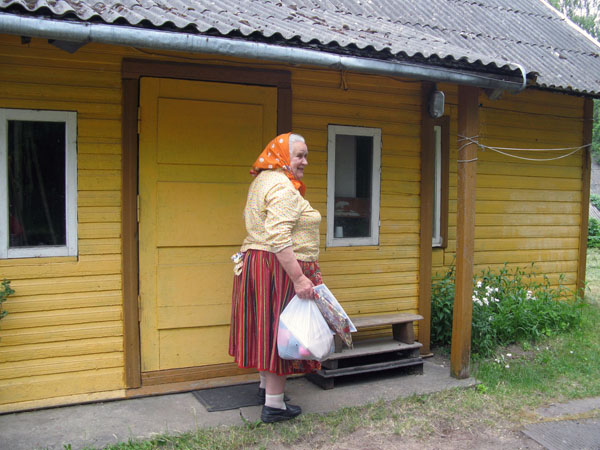 Je voelt je een bevoorrecht breier als je de kans krijgt om op Kihnu eiland in Estland de beroemde Kihnu Roosi op te halen als je met je breivrienden in de Kihnu taxi over het eiland scheurt. De chauffeur haalt haar op bij het huisje waar ze woont nu ze ouder wordt. Enorme zwaar geurende seringenbossen maken het tot een idyllisch plaatje dat op mijn netvlies gebrand lijkt. Na de workshop in het museumpje (daarover later meer), gaan we met haar naar Elumõnu, de boerderij waar ze opgroeide en jaren heeft gewoond. In die jaren stouwde ze het huisje vol met haar prachtige handwerken en de patronen die ze door de jaren heen verzamelde. Er is geen slot op de deur, maar de bezem onder de klink geeft aan dat er op dat moment niemand is. Bang voor diefstal? Probeer maar eens van het eilandje af te komen zonder dat iemand van het eiland er erg in heeft……