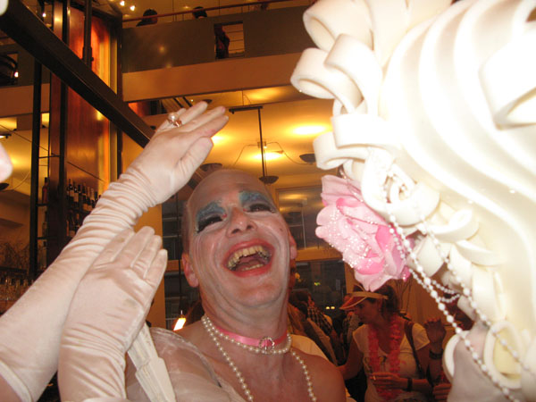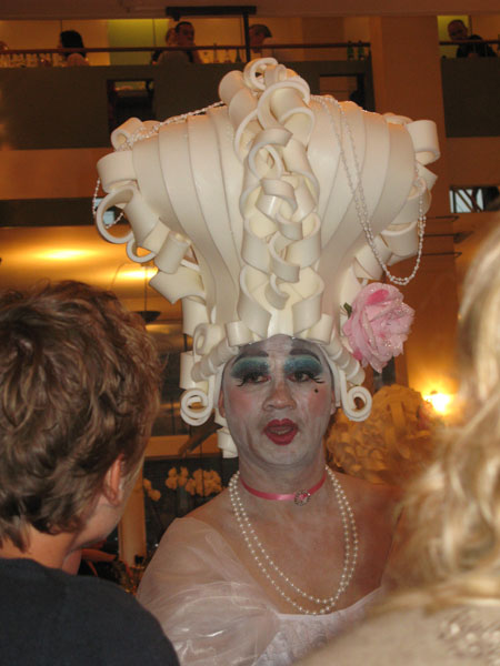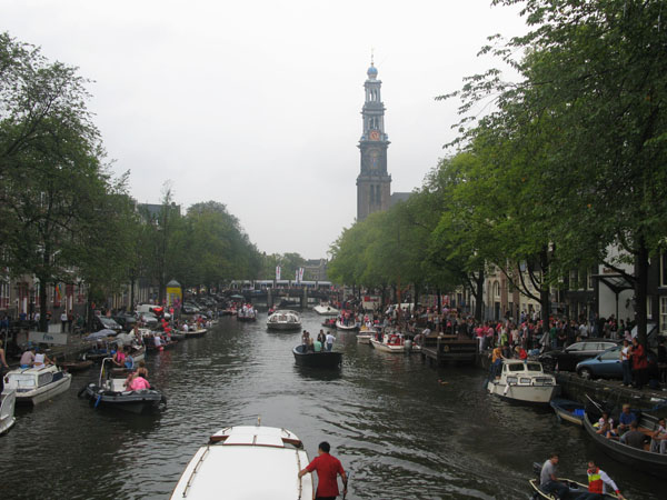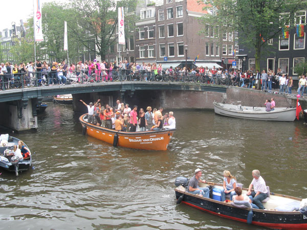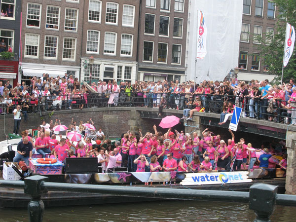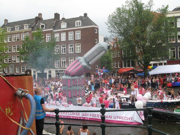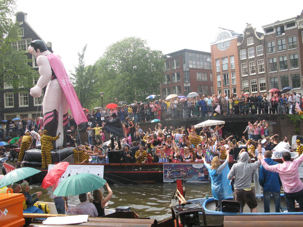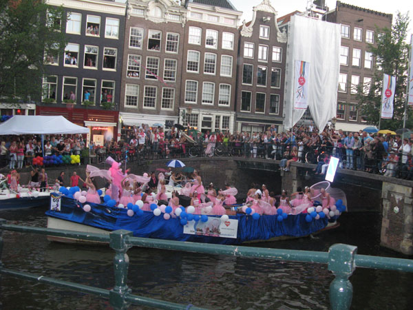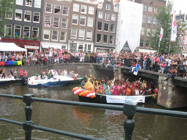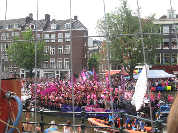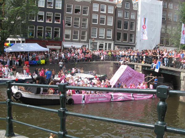 Totally off topic, but lots of fun! Saturday we were at the Gay Parade in Amsterdam. Only one shower and for the rest excellent weather. Great, such creativity was put in designing and making the costums and boats. For every low bridge most of the decoration on the boots have to be make flat. Everything could be pulles down, be folded or was inflateble. We had a good place near the Anne Frank House and the Westertoren. A cheerful day that ended in the pub, where seven of eight beautifully dressed ‘ladies’ finally could scratch their heads beneath the foam wigs.
