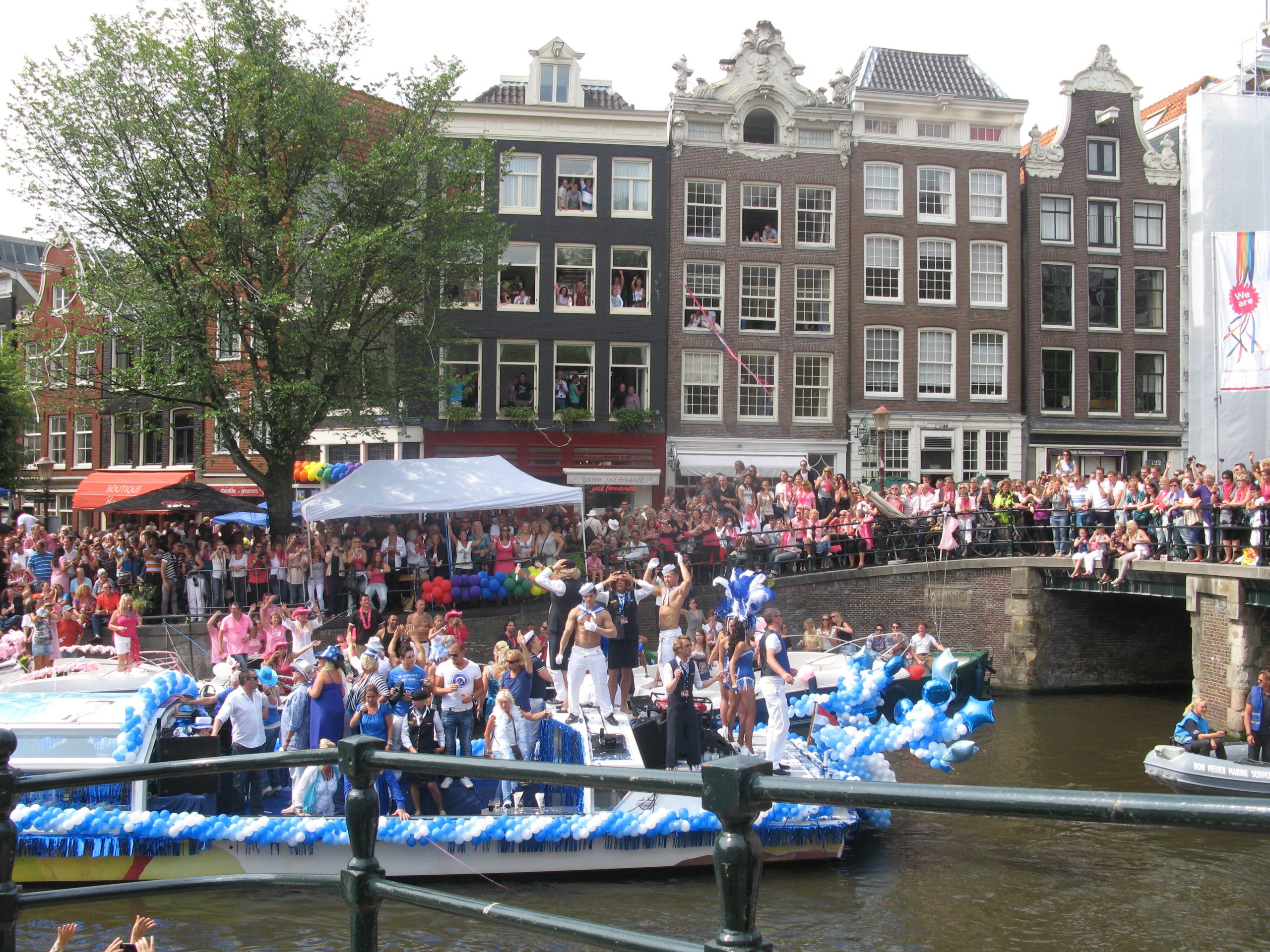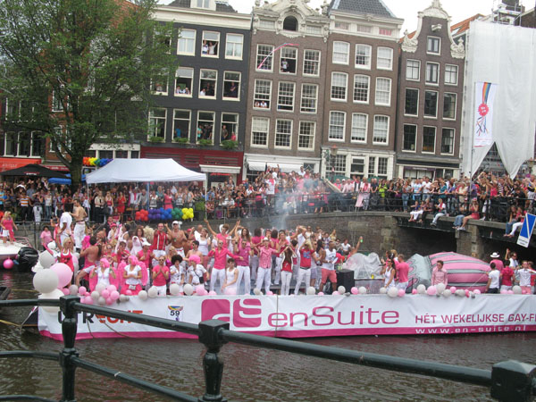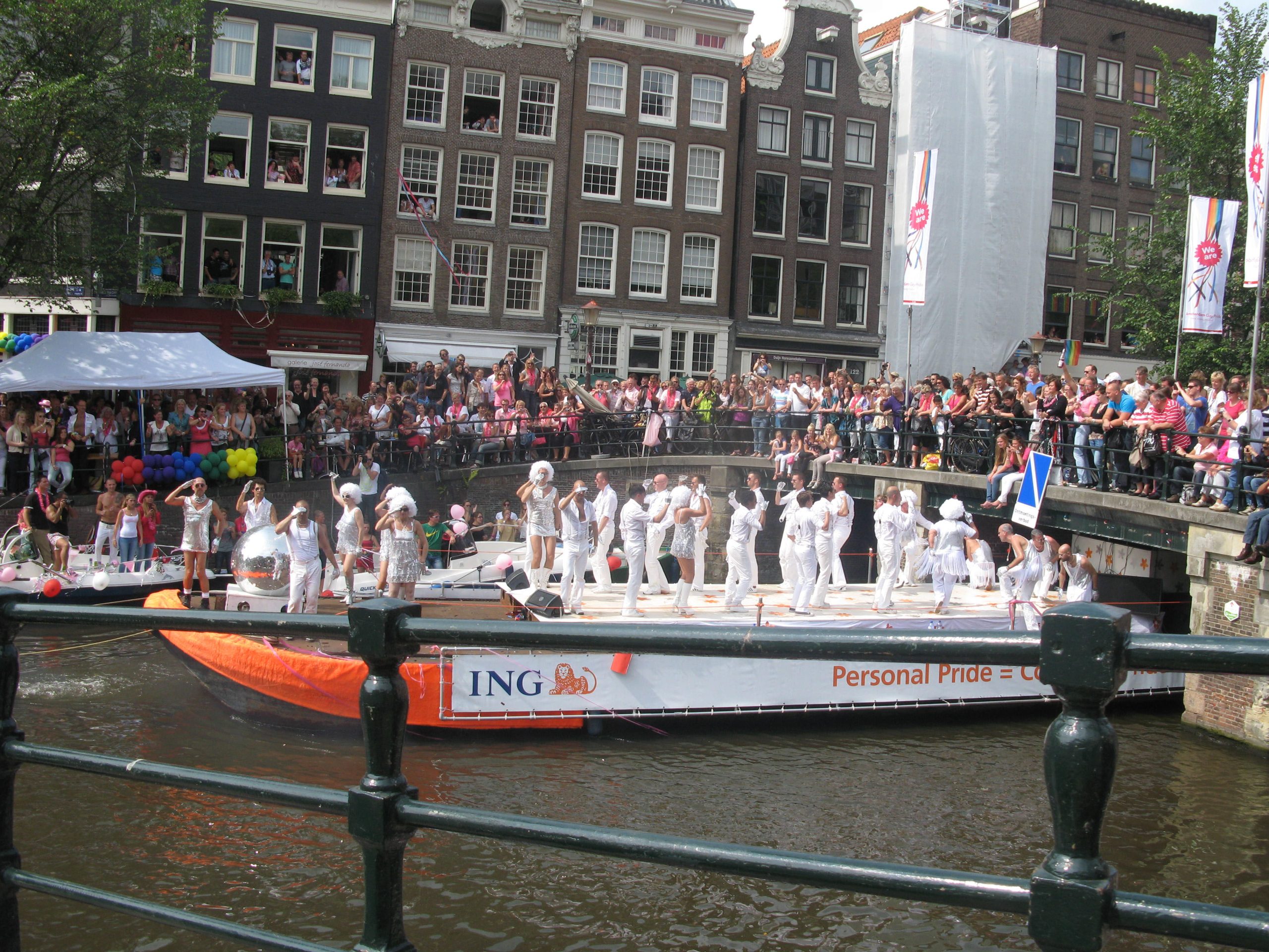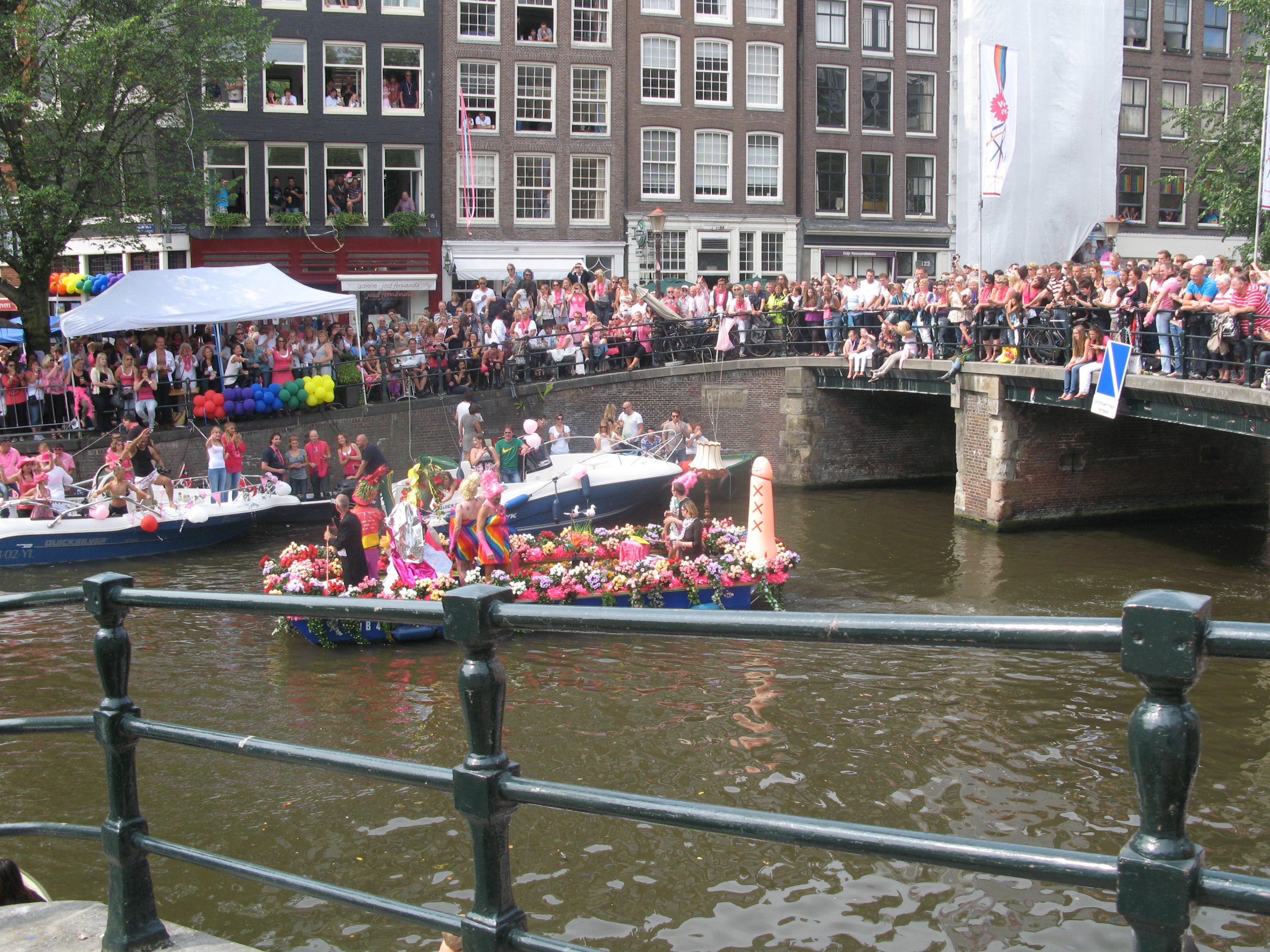 Totaal off topic, maar wél vreselijk leuk! Zaterdag waren we bij de Gay Parade in Amsterdam. Slechts één bui en verder prima weer. Geweldig, wat een creativiteit is er gestoken in het bedenken en maken van kostuums en de aankleding van de boten. En bij iedere lage brug moet menig bouwwerk volledig plat op de boot. Alles opklapbaar, vouwbaar of opblaasbaar….. We hadden een prachtig plekkie vlakbij het Anne Frank-huis en de Westertoren. Een vrolijke dag, die einigde in de kroeg, waar zeven of acht prachtig uitgedoste ‘dames’ eindelijk even hun hoofd mochten krabben onder de piepschuim pruiken.