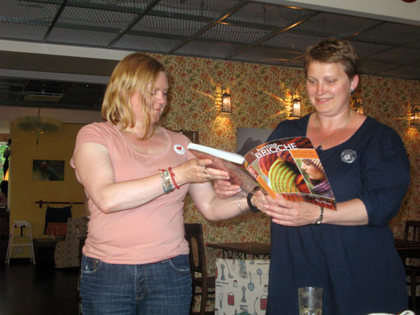 Het delen van kennis is belangrijk, dat is waar we in de breiwereld met z’n allen beter van worden. Als dank voor het delen in de kennis van de Estlandse breiers bieden we dan graag iets uit eigen keuken aan, dus gaven we tijdens ons verblijf in Estland een gratis lesje Brioche (Patentsteek). Nancy Marchant, The Queen of Brioche, schreef er haar meesterwerk Knitting Brioche over en op haar verzoek verspreiden wij met veel plezier de kennis over deze geweldige breitechniek. Een door haar getekend exemplaar van het boek gaven we aan Monika als dank voor het organiseren van de avond. Het was heet en wat rumoerig in Kompott, het schattige restaurantje waar je voor een schijntje heerlijk kan eten, de Nederlandse breivrienden waren eigenlijk doodmoe van de overvolle week en er was zelfs één cursist behoorlijk teut (rustig maar Gerard, we noemen geen namen). De Estlandse breiers, onder wie Monika, Liivi, Liina (van de prachtige Haapsalu-kantbreisels) en de medewerkster van de wolfabriek Aade Long in Rasikuu, deden erg hun best en produceerden prachtige proeflapjes. Je kan zien dat het breien hen in de genen zit. Ondertussen oefende Jans spontaan en geheel onbedoeld nog even het breien van een knoopsgat.