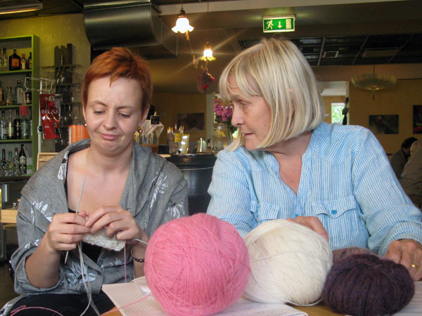 Sharing knowledge is important, that’s what helps us all to grow. To thank the Estonian knitters for sharing their knowledge with us we offered some of our knowledge to them by giving a class Brioche during our stay in Estonia. Nancy Marchant, the Queen of Brioche, wrote the masterpiece Knitting Brioche about this stitch and on her request we share our knowledge about this wonderful knitting technique. She signed a copy of the book we gave Monika to thank her for organising the class. Is was hot and a bit noisy in Kompott, the cute restaurant where you can eat for next to nothing, the Dutch knitting friends were dead tired because of the exhausting week and there even was a drunk participant (don’t worry Gerard, we will not tell it was you). The Estonian knitters, among them was Monika, Liivi, Liina (famous for her beautiful Haapsalu lace knitting) and a employee of the wool mill Aade Long in Rasikuu, tried their very best and produced perfect samples. You can see knitting is their genes. Meanwhile Jans spontaneously and without plannnig it, practised knitting buttonholes.