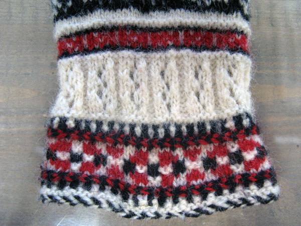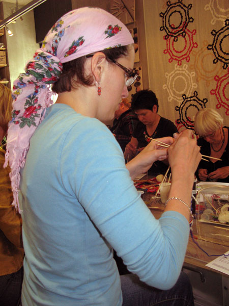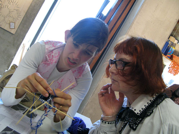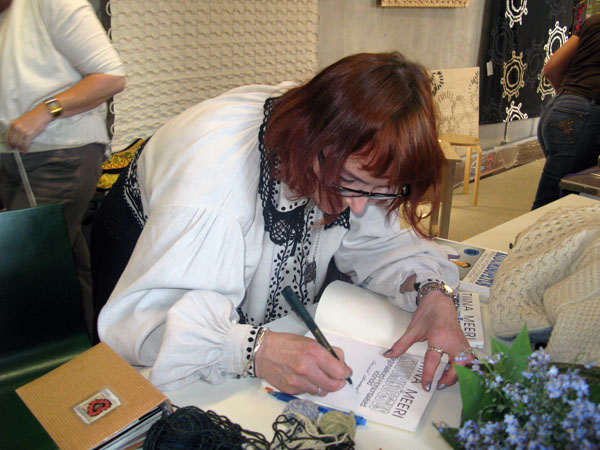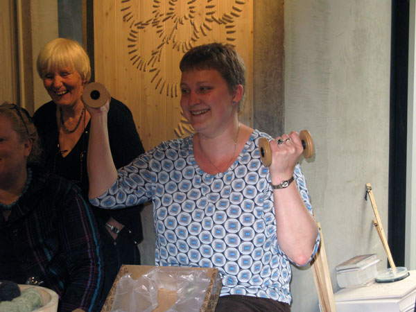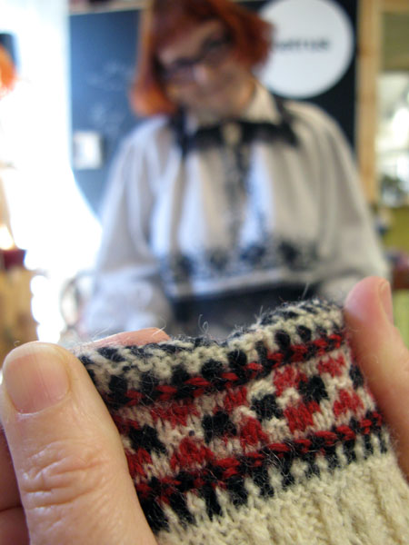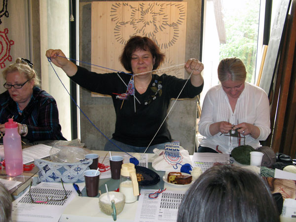 Estonian edges, braids, cast-ons and cast-offs make the colourful traditional Estonian mittens even prettier. Hilly and I had found and tried many of them already but Tiina Meeri, an authority in the knitting world and author of several handicraft books among which five knitting books, knew many more. She makes the nupps in a different way, rounder, bigger and more striking than Nancy Bush does. She gave us a workshop at high speed. One special technique was explained after the other. Dressed entirely in a handmade costume from the area she comes from, she gave instructions in an unparalleled manner that not everyone could follow. Most of us enjoyed it thoroughly but soon a few grew green about the gills and stepped back into the wings.