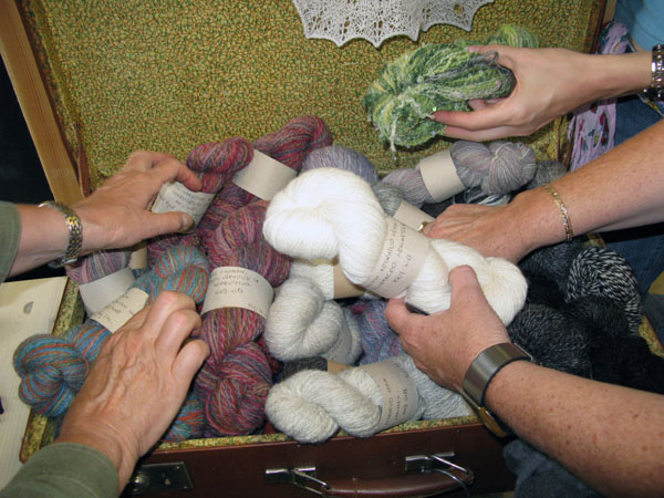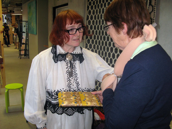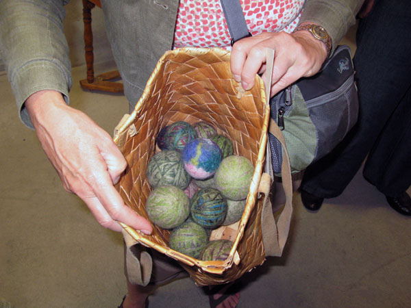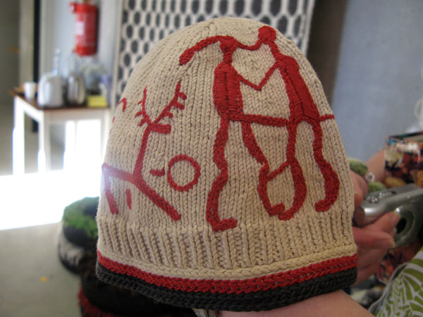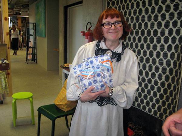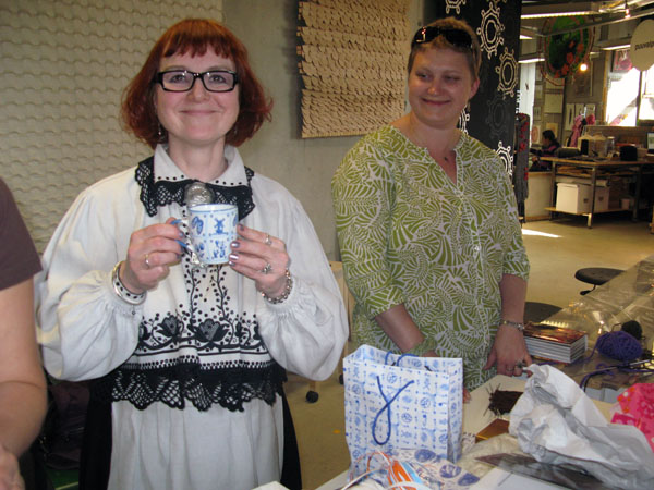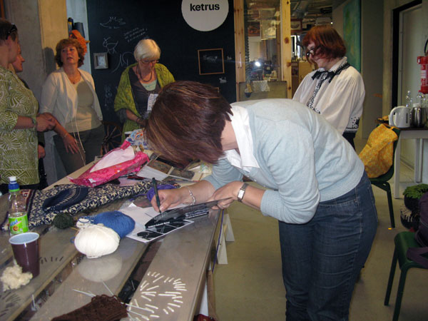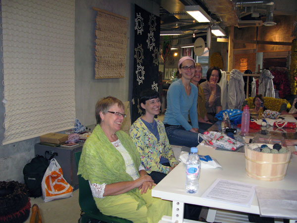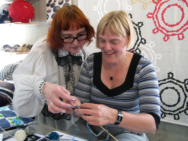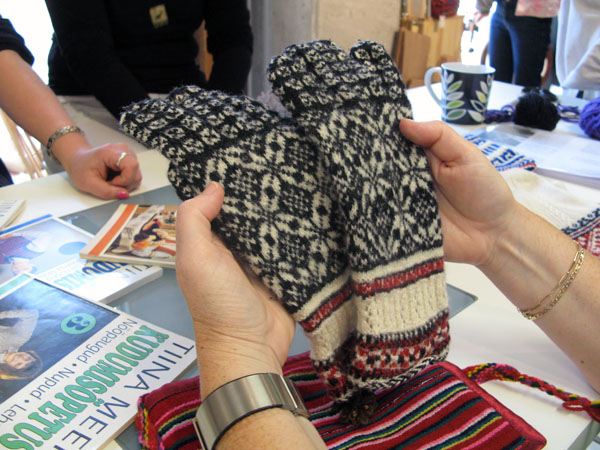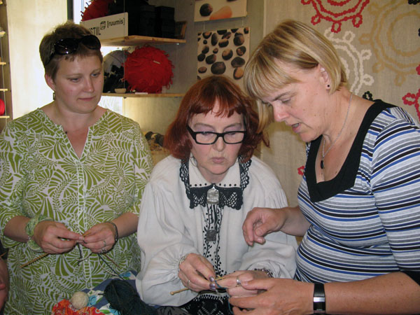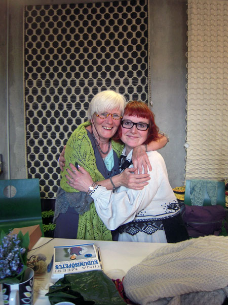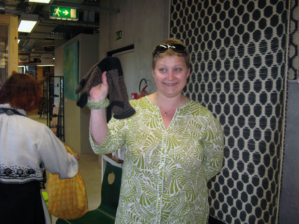 A little nervous she was, she said immediately, for she had not given a workshop for twenty years. But when she discovered how interested we were, she went for it all the way and flew like a twittering little bird from one to the other. She did not want to get paid for her services so we loaded her with gifts. Tiina gave Monika the socks she made especially for this workshop as thanks for lending her the studio. The socks are a treasure from one of the most important knitting artists in the country and Monika will undoubtedly treasure them. We left treasuring a fantastic memory of a very special lady whom we hope to meet again.