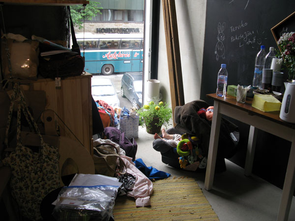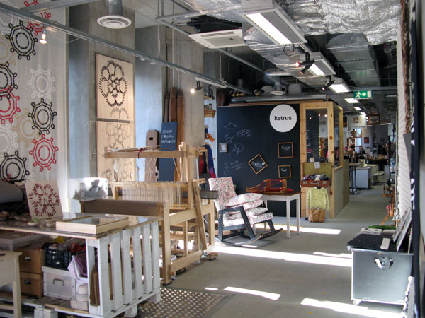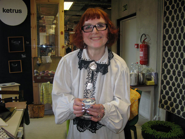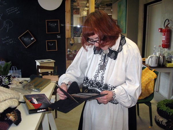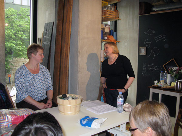 Monika’s studio is focussed on knitting and yarn. Her cosy corner is located between a silver smith and an artist that likes it more to embroider on wood then textile. The case with handspun yarn can’t be ignored. Ministers that visited the center signed Monika’s black board. All radiates creativity and invites to join in. Here we found a place for your workshop Twined Knitting and the workshop of Tiina Meeri. The only disadvantage of Loovala is the location, much to close to the big chocolate shop Kalev……