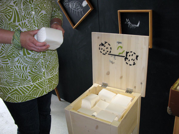 Monika’s atelier in Loovala is vrijwel geheel garen- en breigericht. Haar gezellige hoekje bevindt zich tussen een zilversmid en een kunstenares die liever op hout dan op stof borduurt. Een bak met haar handgesponnen garens kan je bijna niet voorbij lopen. Ministers op doortocht door de ateliers tekenden haar schoolbordwand. Alles straalt kreativiteit uit en nodigt uit om mee te doen. Hier vonden we een plekje voor onze workshop Twijnend Breien en de workshop van Tiina Meeri. Het enige nadeel van Loovala is de lokatie, veel te dicht bij de chocoladewinkel Kalev……