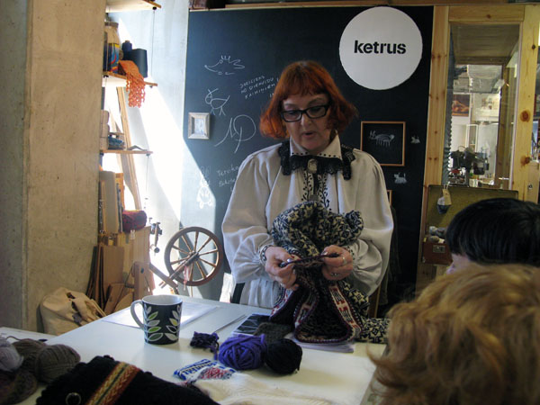 Een beetje nerveus, dat was ze wel, zei ze al direct, want ze had al 20 jaar geen workshop gegeven. Maar toen ze ontdekte hoe geïnteresseerd wij waren, ging ze er helemaal voor en vloog als een kwetterend vogeltje van de een naar de ander. Betaling voor haar diensten wilde ze niet, dus hebben we haar overstelpt met cadeautjes. Tiina gaf Monika als dank voor het uitlenen van haar atelier de sokken die ze speciaal voor de workshop had gebreid, een relikwi van één van de belangrijkste breikunstenaars van het land, dat Monika zeker zal koesteren. Wij vertrokken met een geweldige herinnering aan een bijzondere vrouw die we hopelijk nog wel eens terug zien.