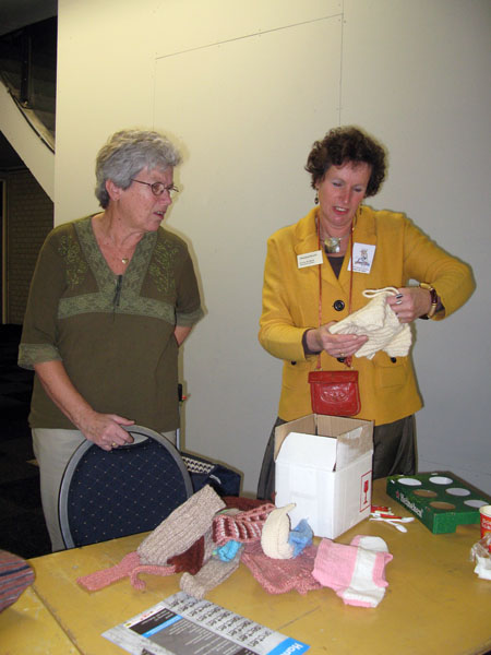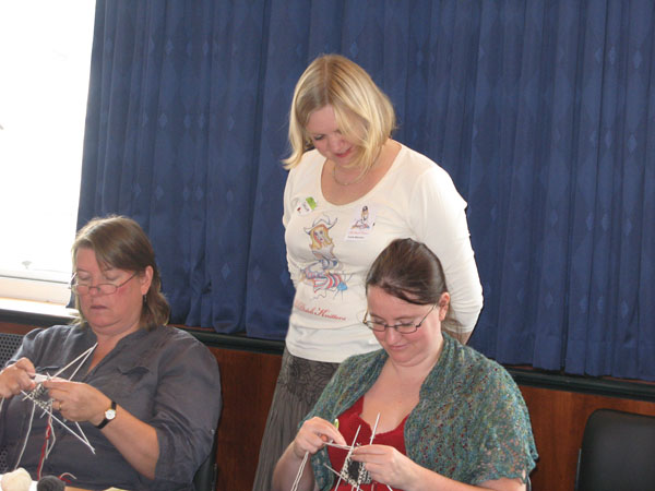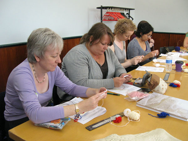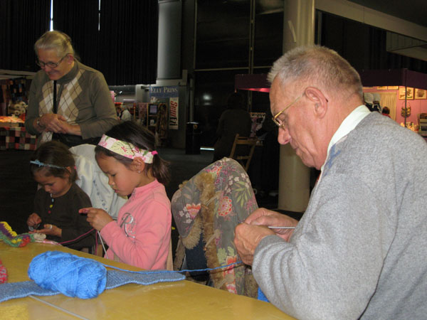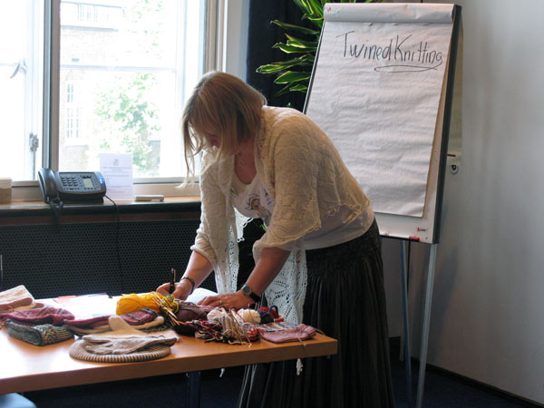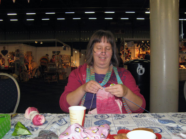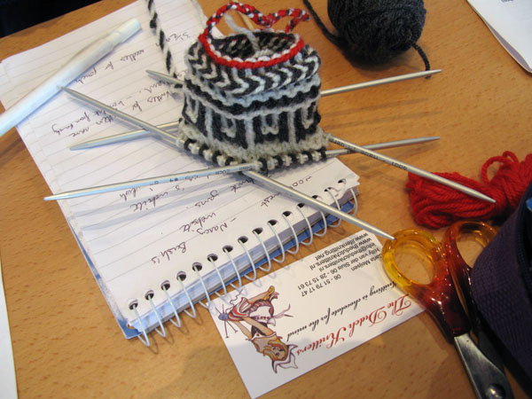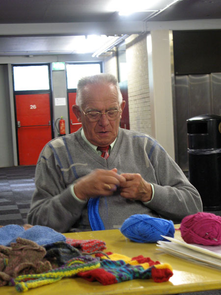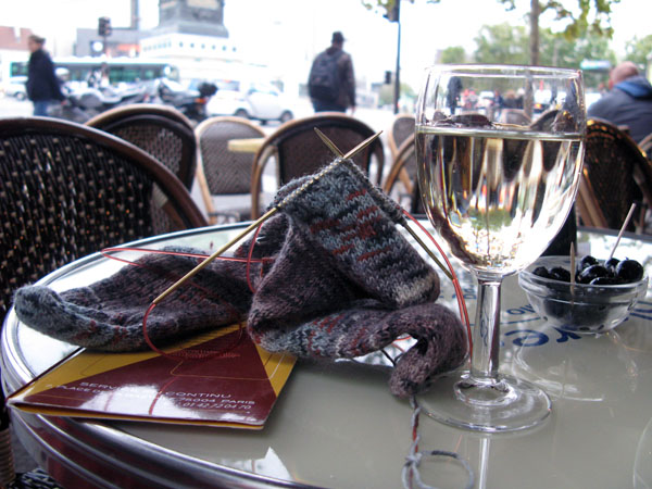 Hoewel we niet op zoek waren naar brei-gerelateerde zaken, werden we op iedere hoek van de straat geconfronteerd met het fenomeen breien. Etalages puilden uit van de breisels en vaak had ook het etalagemateriaal met breien te maken. Op het hoofd van menige française prijkte een gebreide baret. In Arts et Metiers zagen we twee lieve poedeltjes, een moedertje van 23 jaar oud (!) en haar dochter. Ze hielden hun ruggetjes warm terwijl ze uitgelaten werden door hun vrouwtje, de moederpoedel met een rood gebreid dekje. En ik zat op menig terras (ja, het weer werkte de meeste tijd goed mee) en andere bijzondere plekjes lekker een toertje te breien aan mijn sokken.