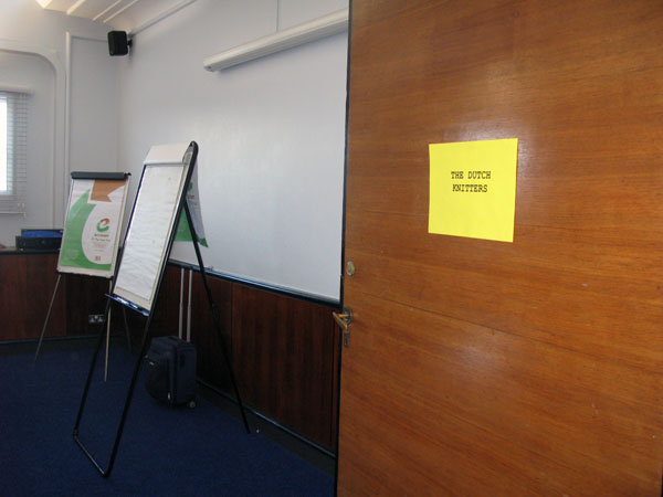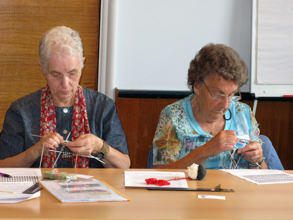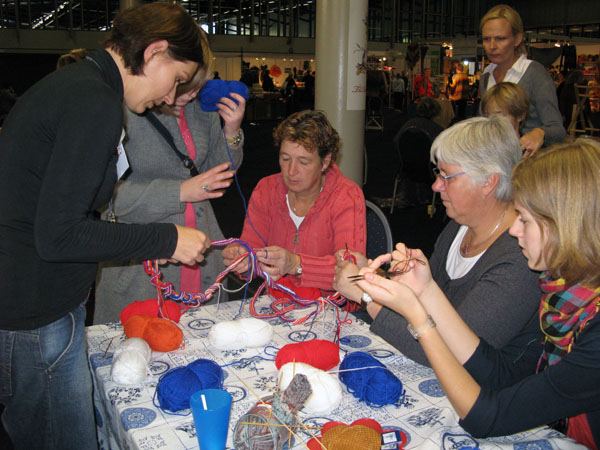 We were not looking for knitting, but on every corner of the street we were confronted with the phenomonon of knitting. Shop windows were stuffed with knitwear and often the requisites used were knitting related too. On many French heads there were knitted bonnets. And in Arts et Metiers we saw two lovely poodles, a mother (23 years old!) and her daughter. They kept their backs warm with dog coats, the mother was wearing a red knitting coats. And on many terraces (yes, most of the time we had good weather) I knitted a few rows on my socks.