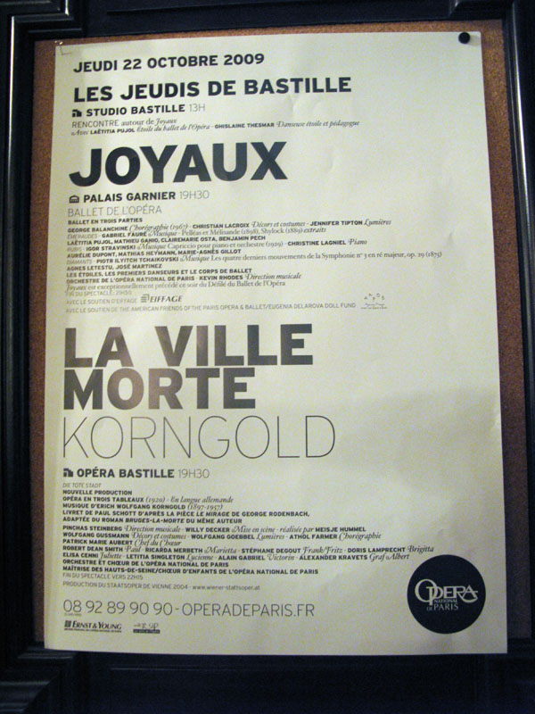 Dankzij Yvonnep’s enthousiame voor ballet kwamen we op het idee om naar de première van Joyaux van Balanchine te gaan in de Opéra Garnier. Op de dag zelf konden we alleen nog de laatste spotgoedkope kaarten voor de engelenbak krijgen, maar tot onze verbazing bleek dat een aardedonker tweepersoonskamertje in de nok van de zaal met twee schattige stoeltjes en redelijk zicht op het toneel. We brachten daar de avond door, gezellig samen hangend over de balustrade, genietend van de muziek en een geweldige voorstelling. Het is op zich al leuk om het overdadig gedecoreerde gebouw van binnen te zien, maar ook de voorstelling was boven verwachting, vooral ook door de prachtige kostuums ontworpen door Christian Lacroix.