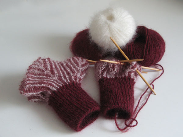 I wasn’t of much use anymore last night, for I couldn’t wait to start knitting a set of wrist warmers, of which Nancy showed me the originals some months ago. One is finished already. And the second one almost. I immediately bought some nice Kidsilk Haze and Kid Classic at De Afstap, because I wanted to start right away! Lovely to knit this fantastic pattern with these nice materials. And addictive, I want them in all colours to go with all my coats and sweaters……