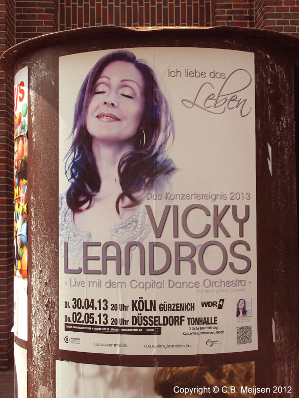 Ich liebe das Leben in Düsseldorf 2 Mai 2013 gab Vicky Leandros eine sehr erfolgreiche Konzert in der fast ausverkaufte Tonhalle in Düsseldorf. Das Publikum wurde dieses Mal vorgestellt auf eine schöne Mischung aus Balladen und den größten Hits. Musicalisch war es wunderschön abgegrenzt von der Capital Dance Orchestra aus Berlin. Reine Musik in Kombination mit der charismatischen Stimme und Performance von Vicky! Der kurze, vorherige Zusammenarbeit im Jahr 2011 im Dezember Konzerte in Berlin war gut und führte zu einer neuen Partnerschaft. Im Dezember 2011 war man in Stil und musikalische Begleitung noch nicht ganz miteinander gewöhnt. The Capital Dance Orchestra spielt in der Regel nach Tanzmusik in einer Vorkriegs-Einstellung, während Vicky’s Repertoire Chansons, Flokore, Pop-Songs und Schlager umfasst aus den Jahrzehnten 60’ bis bis heute. Während dieses Konzert war die Zusammenarbeit perfekt. Das Konzert fang an mit einer Ouvertüre vom größten Hits, die der Publikum gleich in einer gute Stimmung hat gebracht. Dann trat Vicky majestätischen auf der Bühne, in einem glamourösen Outfit gekleidet. Das Applaus began und bis zum Ende des Konzert wird diese fortgesetzt. Eine Reihe von Liedern folgten einander, von Vicky erklärt mit Erinnerungen und Anekdoten, die sie mit diesen Liedern verbinden. Höhepunkten waren ihre neue Interpretationen von ‘Wenn du jetzt gehst’, ‘Möge der Himmel’ der Söhne Mannheims, ‘Valentin’ und ‘Après toi’. Vicky erklärte das viele ihrer Liedern unbewusst oder bewusst autobiographische Elemente enthalten. Mit den Jahren und Lebenserfahrung werden sie oft werden miteinander verflochten. Die Arrangements wurde auf spannende Weise abgewechselt. Manchmal sang Vicky allein mit Bo Haert, ihre Begleiter am Klavier. Dies gab Liedern wie "Ich Fange ohne dich neu an" eine extra dramatische Dimension, und dadurch wird eine optimale Wirkung erreicht von Vicky’s leistungsstarken, unverwechselbaren Stimme auf das Publikum. Dann wird vom Orchester wieder vollständig musikalische ausgepackt, oft mit cömic-Effekte, wie bei der griechische Medley. Der letzte Teil des Konzerts wurde traditionell für die Hits. Eine Forderung, die Vicky einfach nicht entziehen kann, weil sie machte sehr beliebt. Die Hymne "Ich liebe das Leben", der Name der Tour abgeleitet wurde, war einem Highlight. Dieses Lied, das nun schon viele Covers hat, darunter auch von der erfolgreiche schlagerstar Andrea Berg, erlebt derzeit einen zweiten Lebens in den deutschsprachigen Ländern. Vielleicht erklärt dies die außerordentliche Anwesenheit von viele junge Leute im Publikum. Traditionell endete das Konzert mit einem emotional von Vicky unterbrochen 'Auf Wiedersehn, Ihr Freunde mein'. Eine gute Perspective für ihre Konzerte am19. Mai in Rotterdam, die Erwartungen in der Niederlande sind groß! Linda, John und ich hatten Glück, dass wir eingeladen wurde bei den Proben anwesend zu sein. Auch haben wir Vicky nach dem Konzert kurz gesprochen. Von ihrem festen Assistenten und charmante Tochter Milane begleitet, trafen wir sie Back stage. Sie war aufgeregt über das Konzert und die Zusammensetzung des Repertoires und freut sich auf Rotterdam. Auch erzählte sie uns über mögliche neue Initiativen in den Niederlanden. Sie arbeit noch an ihrer neuen CD und sie schreibt ihre eigene Lieder, in Zusammenarbeit mit zwei Komponisten. Weil sie einen sehr vollen Terminkalender in diesem Jahr hat, erwartet sie, dass die CD später verröffentlicht werden. Es gibt noch viele spannenden Initiativen zu erwarten! Thanks to Johan van Putten, Linda Eweg, Carla Meijsen and Hilly van der Sluis. |